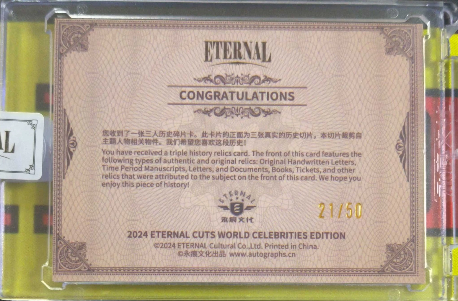 Overall, this is a visually stunning, limited-edition relic that bridges the worlds of science, mathematics, and collectible art. For display or investment, it carries both aesthetic and historical intrigue. Market valuations for Eternal triple relics featuring high-tier figures like Newton generally range between $900 and $1,800, with higher potential if authenticated by PSA/DNA or Beckett. This card—numbered 21/50—represents an impressive example from one of Eternal’s most coveted series and would make a centerpiece for any collection focused on scientific or historical legacy memorabilia.